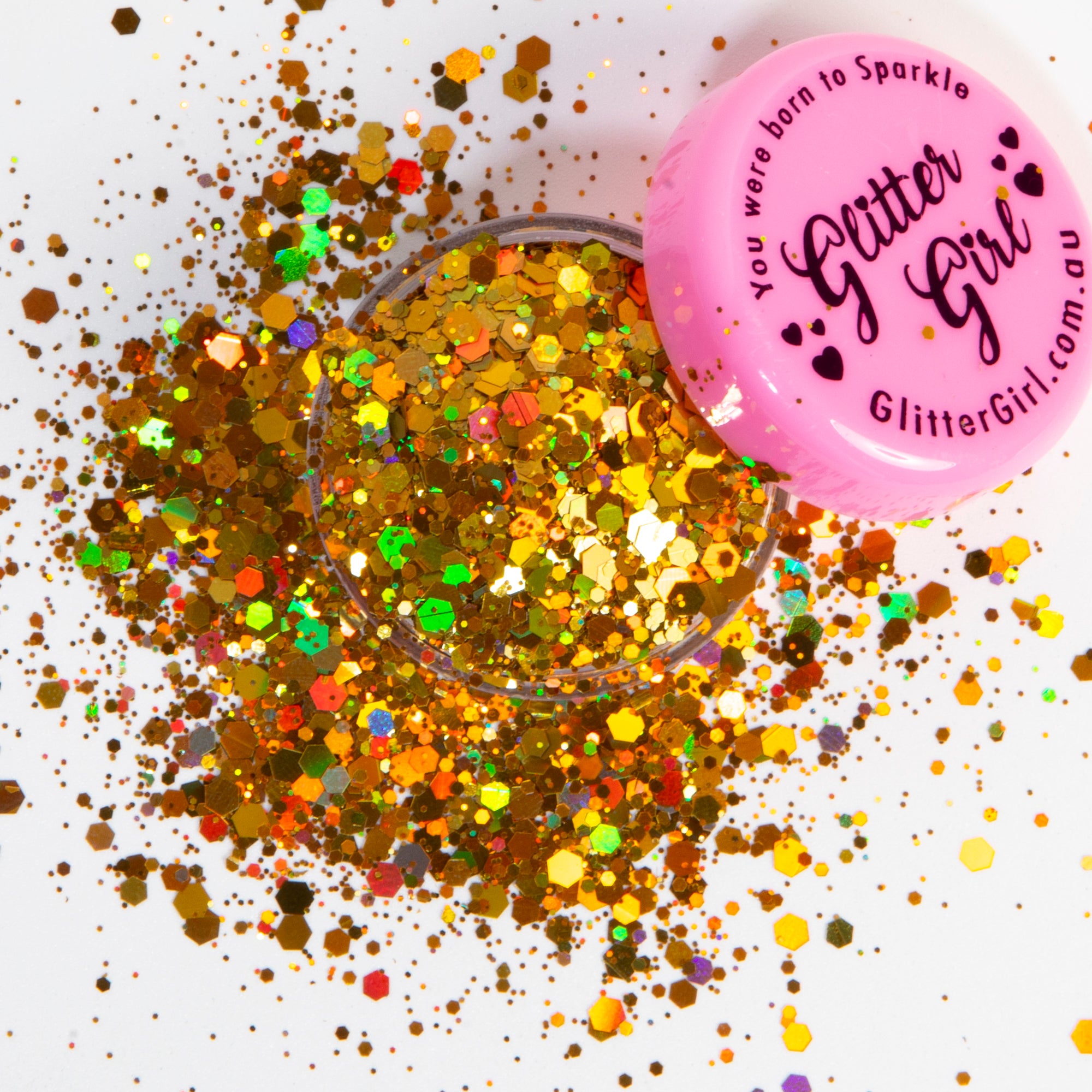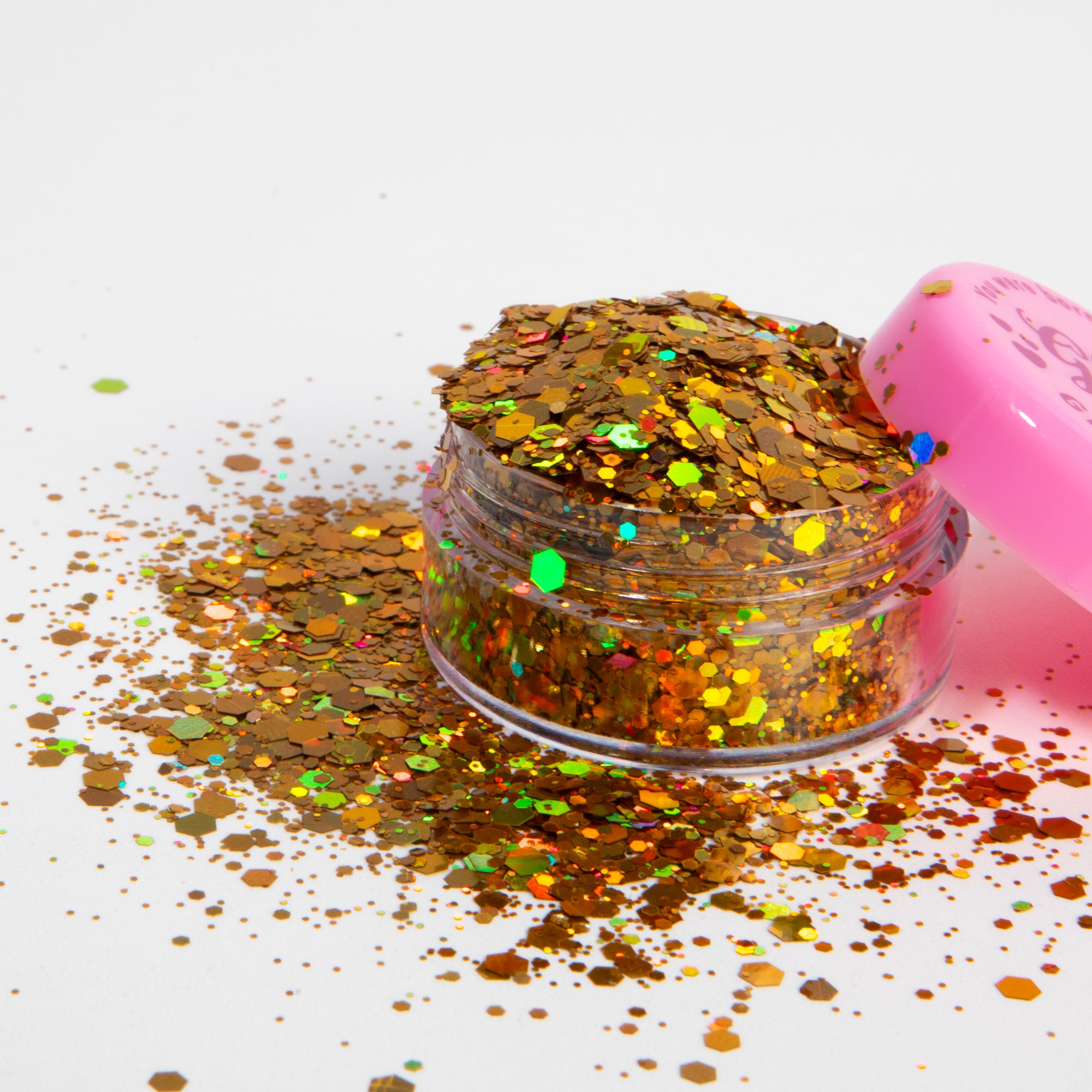 Get ready to shine with Glitter Girl's Loose Glitter in "Disco Nap," a limited edition cosmetic eco glitter mix in an ultra-reflective holographic gold shade. Featuring varying shapes and sizes of hexagons, this dazzling mix is perfect for creating bold, statement looks.