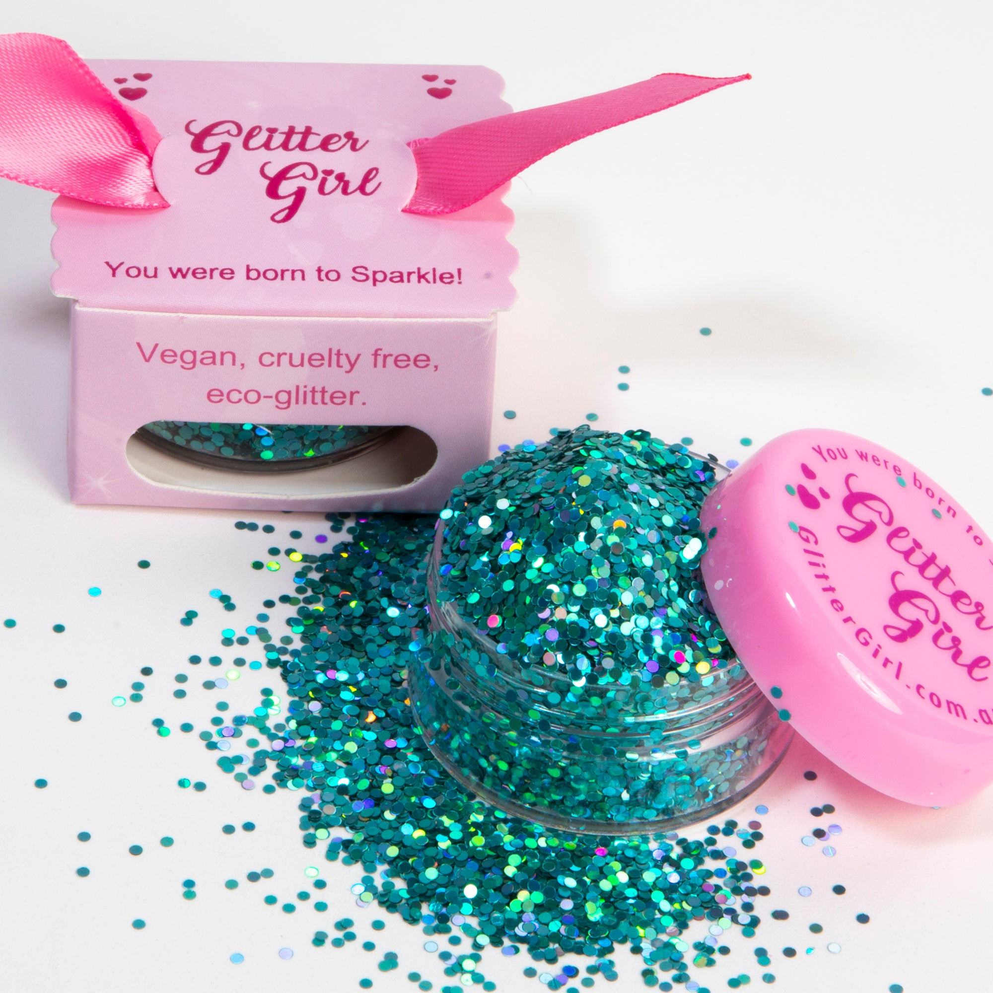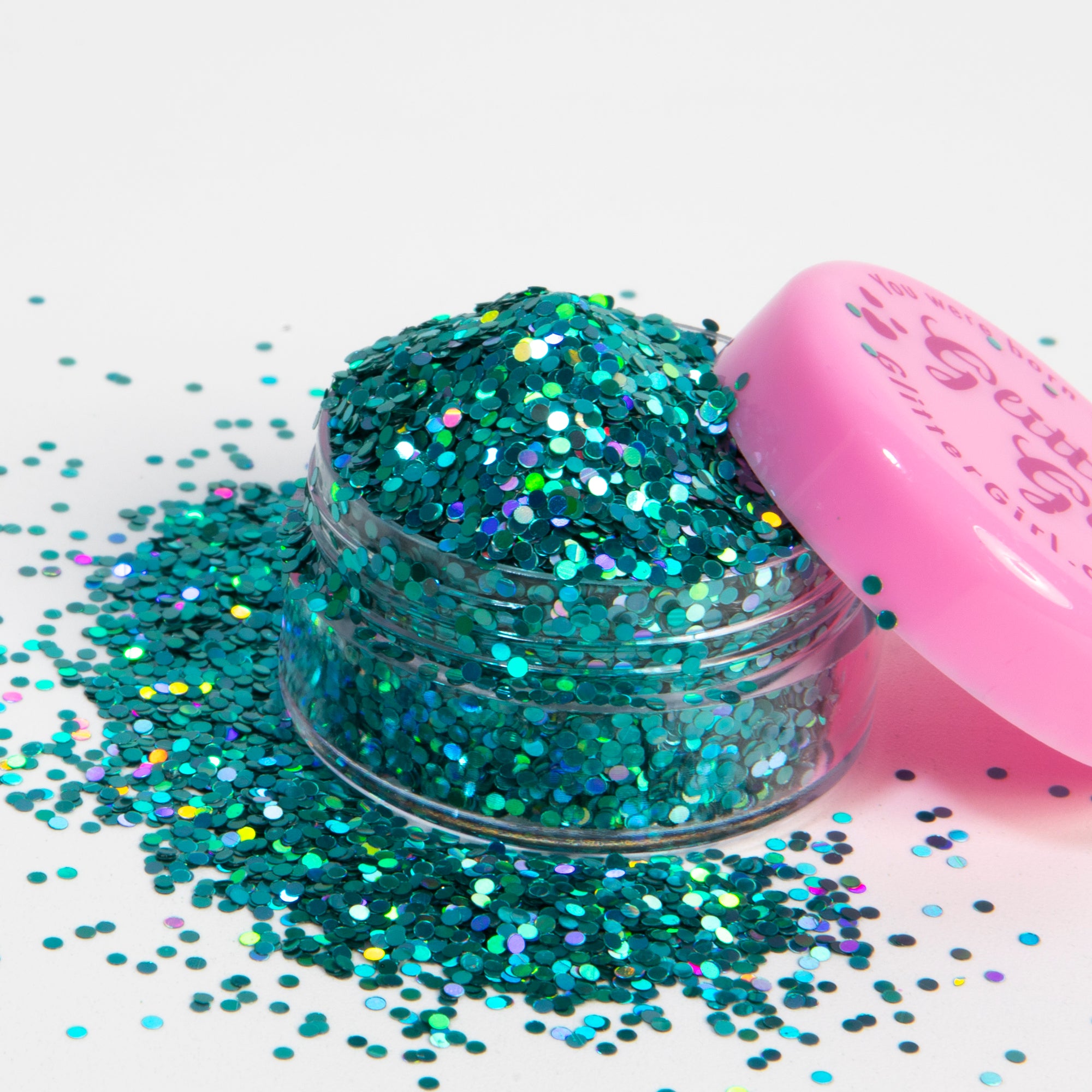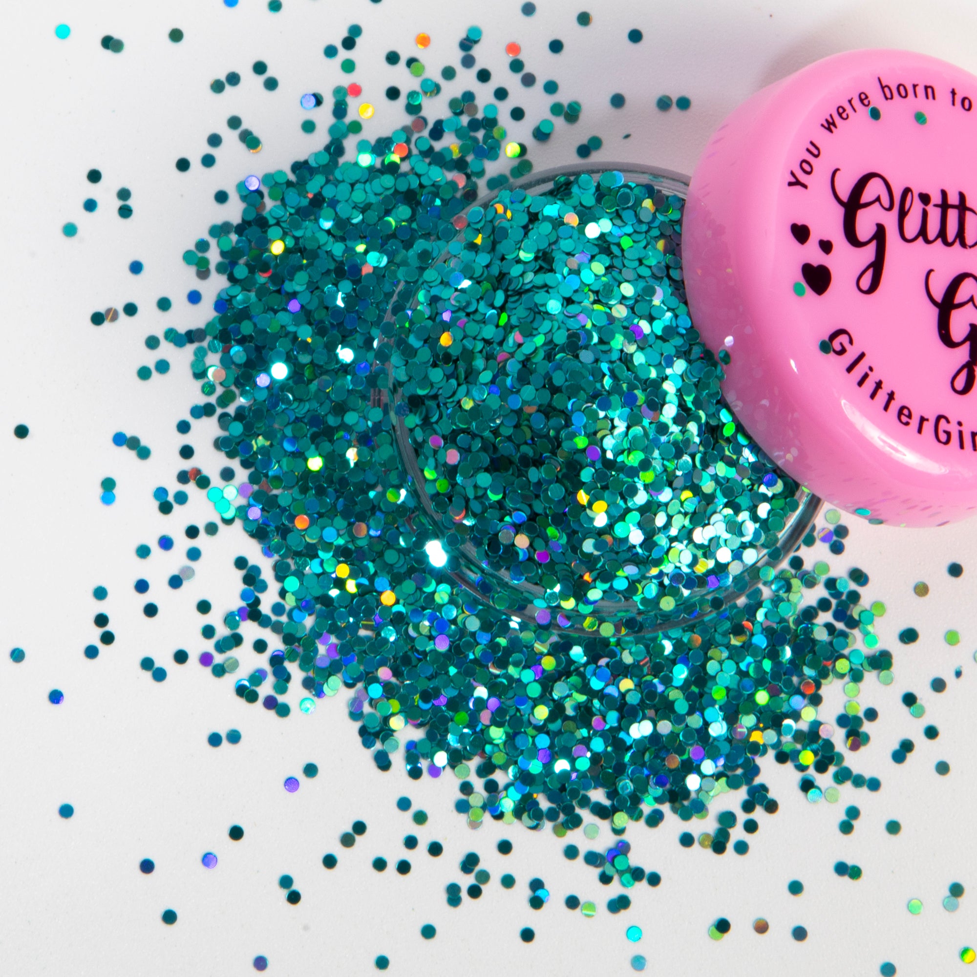 Get ready to shine with Glitter Girl's Loose Glitter in "Aqua Lace," a dazzling cosmetic eco glitter featuring glistening aqua 1mm dots. It's the perfect touch of sparkle for creating magical, ocean-inspired looks.