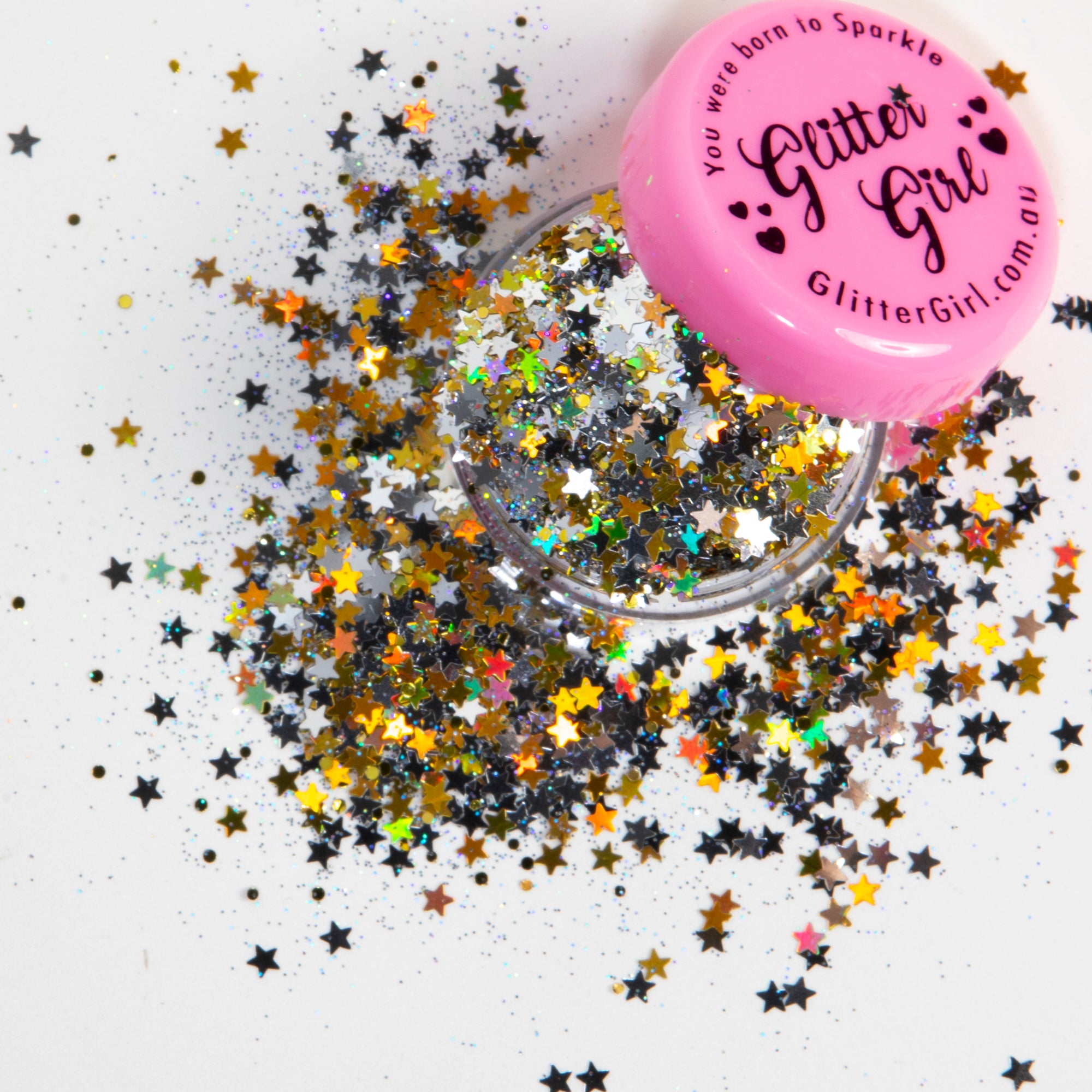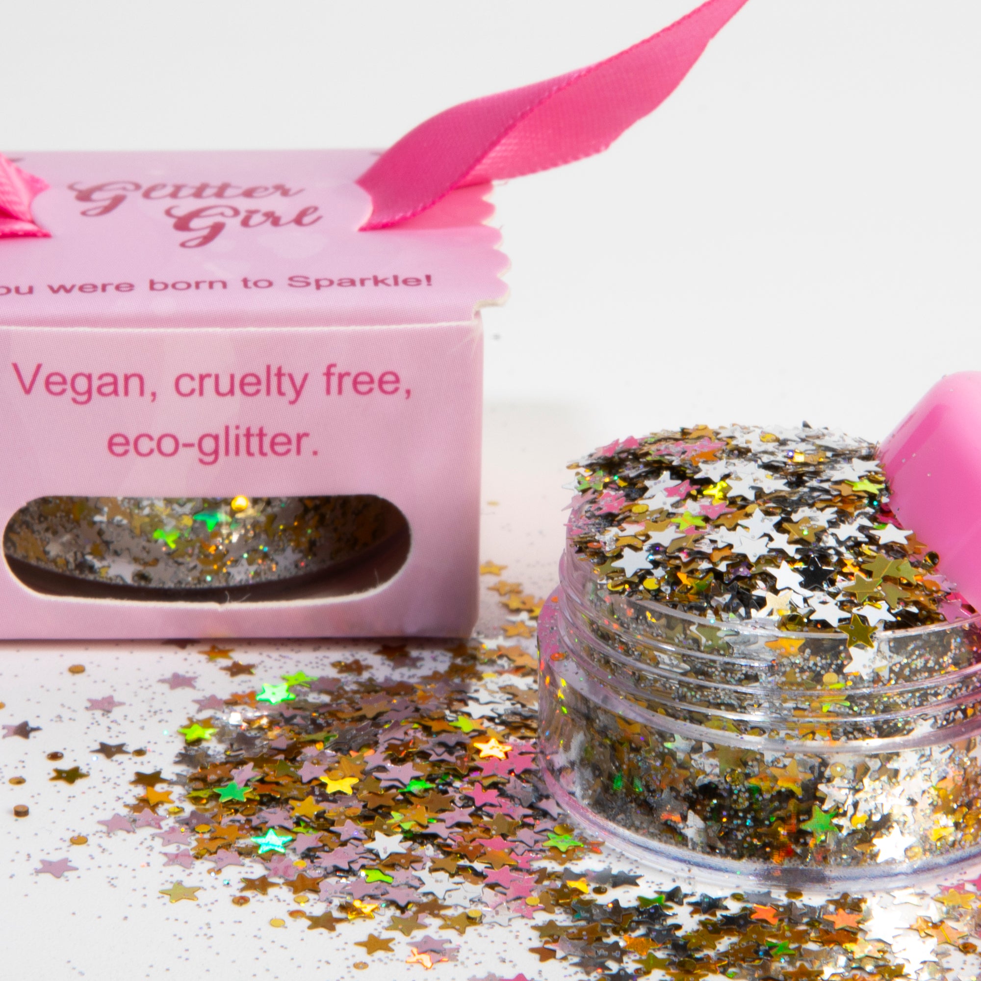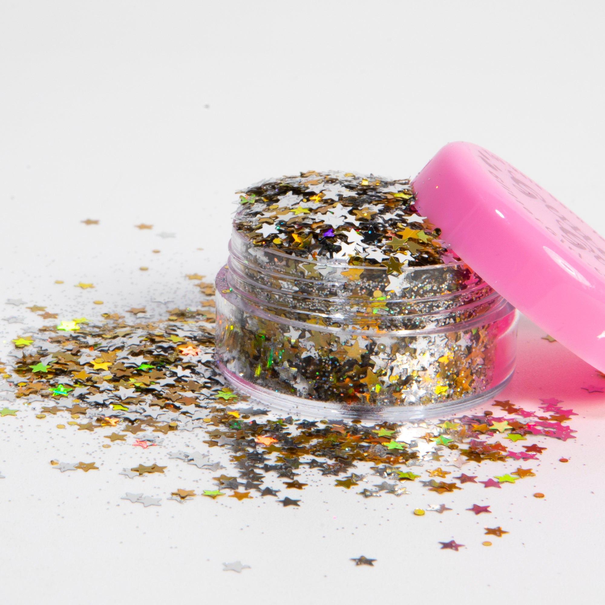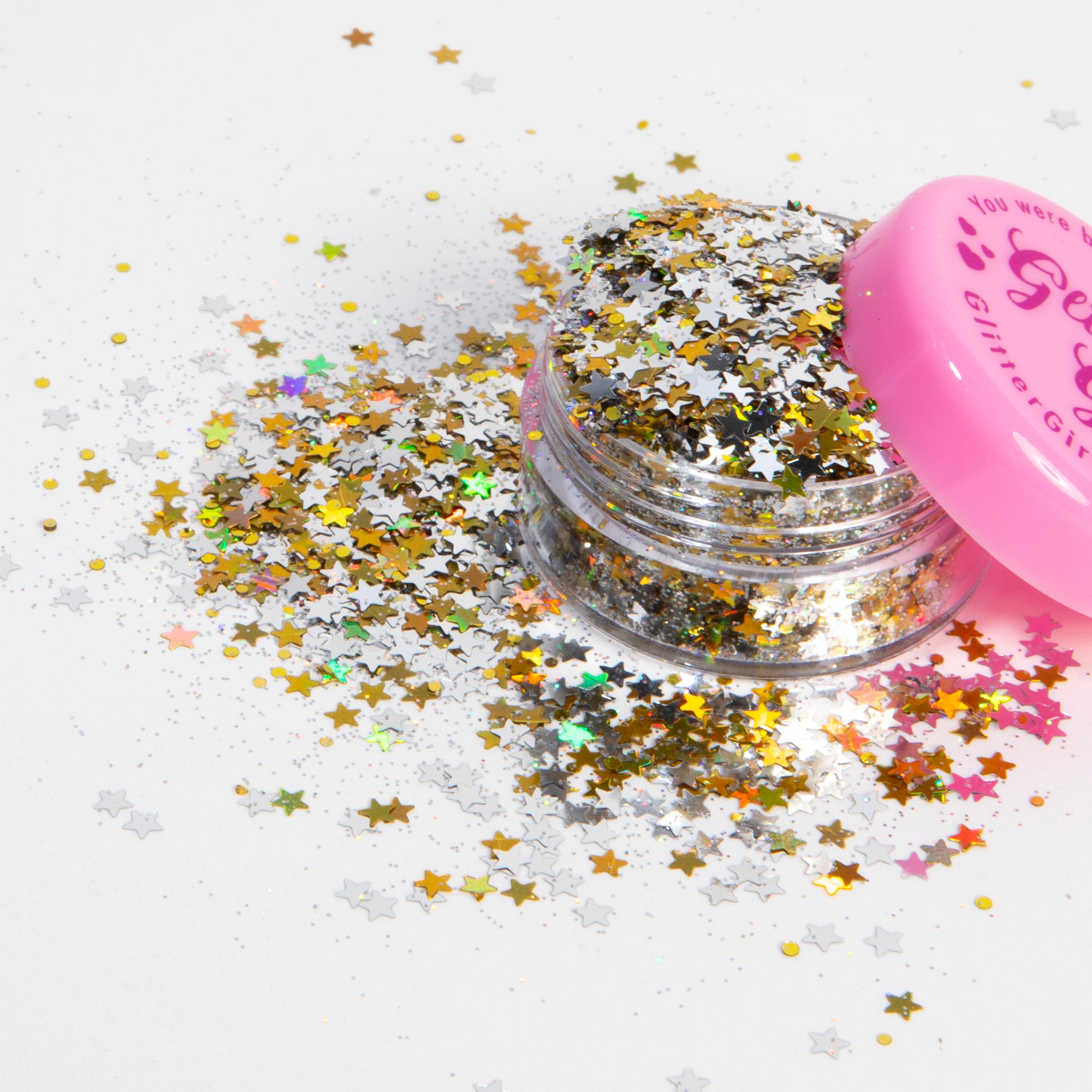 Get ready to shine with Glitter Girl's Loose Glitter in "1000 Stars," a dazzling cosmetic eco glitter in a sparkling gold shade with shimmering star accents. It's so magical, you’ll never want to take it off.