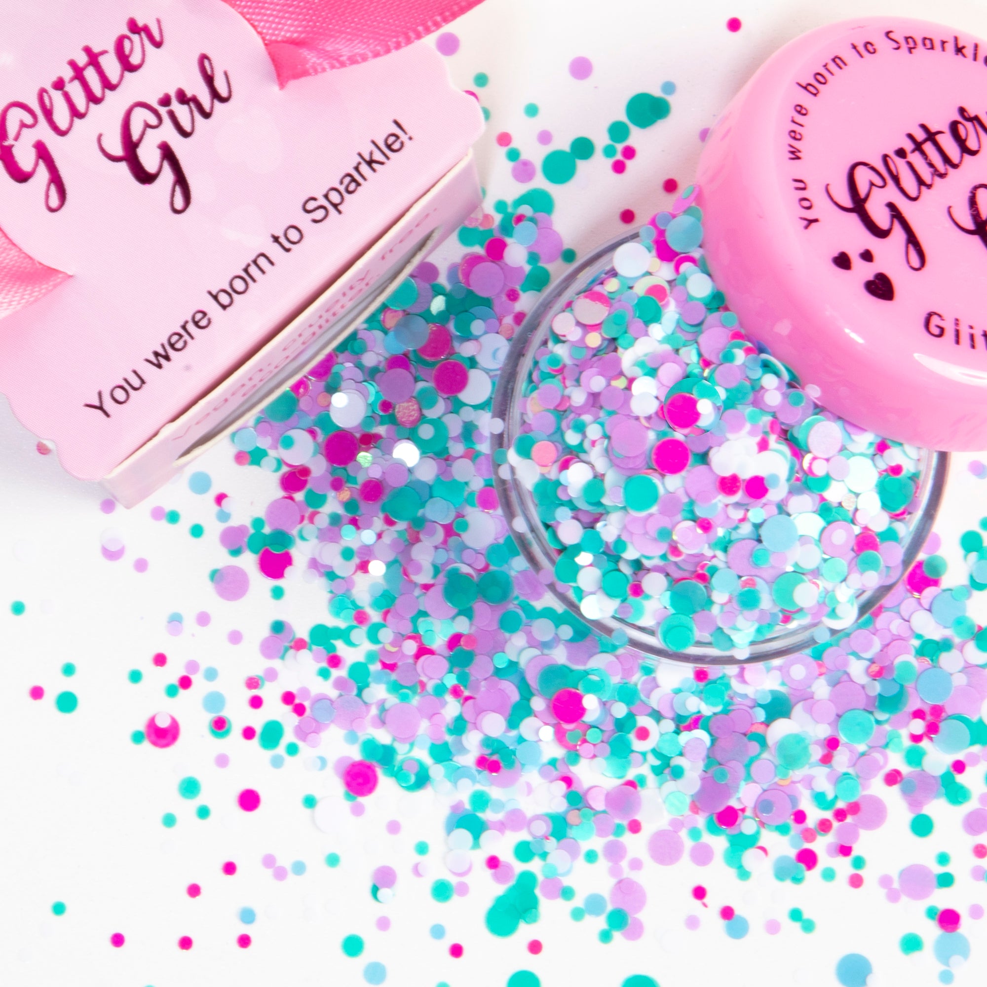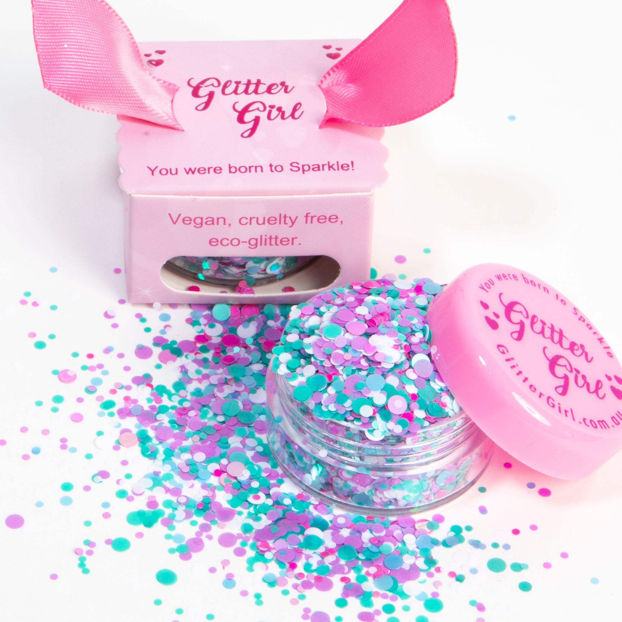 Get ready to shine with Glitter Girl's Loose Glitter in "Mint Crush," a dazzling cosmetic eco glitter mix featuring an adorable blend of pink, mint green, white, purple, and blue. This sweet and vibrant combination is perfect for creating playful, pastel-inspired looks.