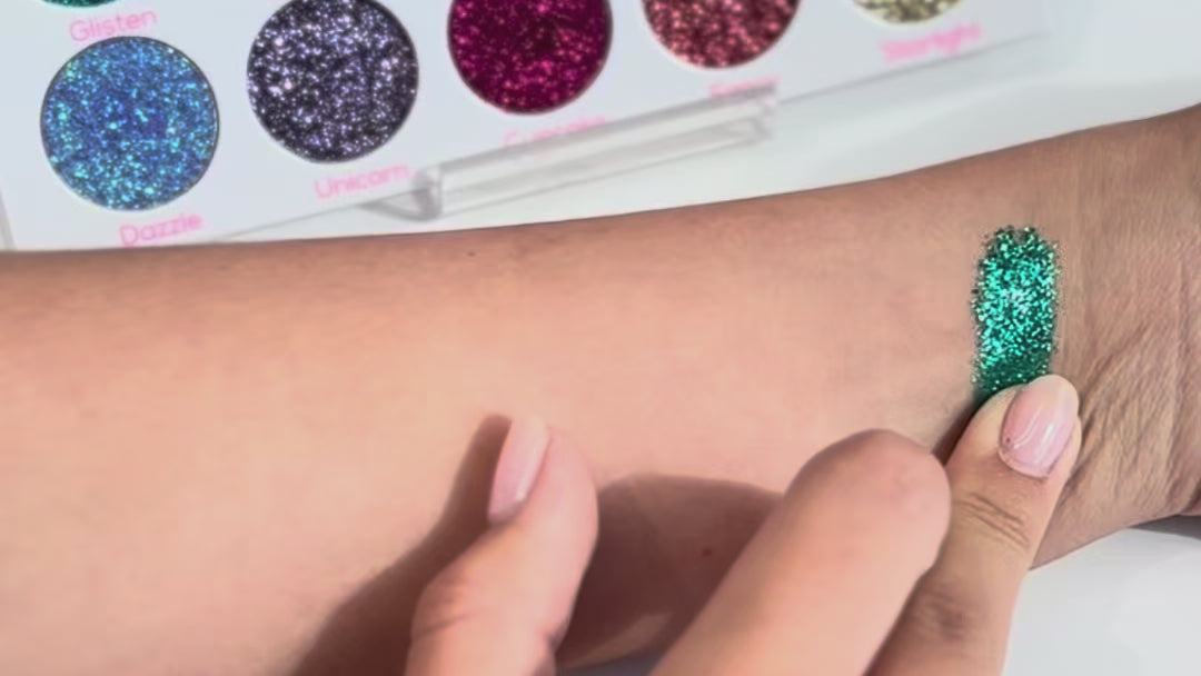 Using our glitter eyeshadows is easy-peasy! Just dab your pinky finger into the pan and press it onto your eyelids, cheeks, or skin for a pop of sparkle. If you want a bolder, more solid look, simply use a hard packed brush to pick up the glitter from the palette.