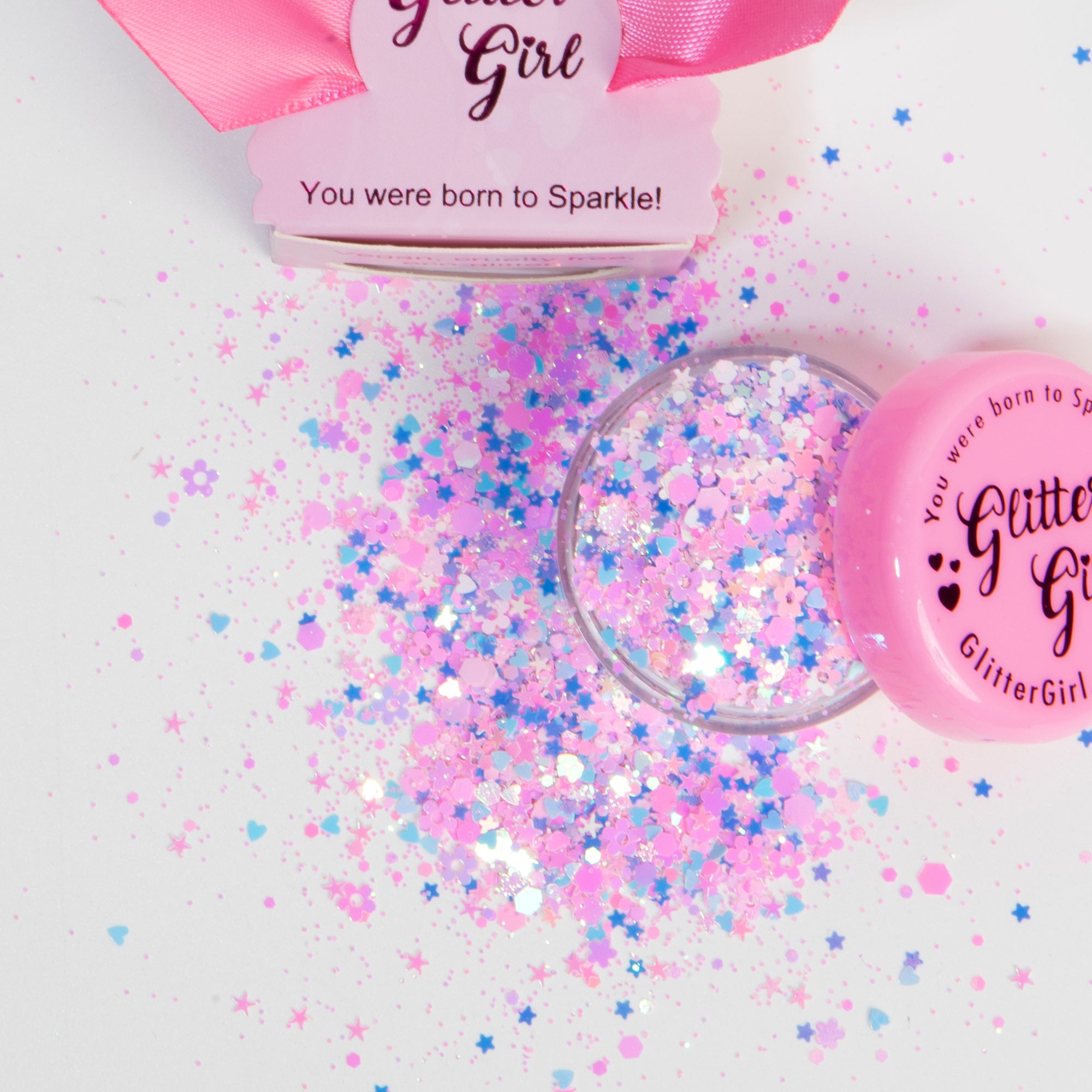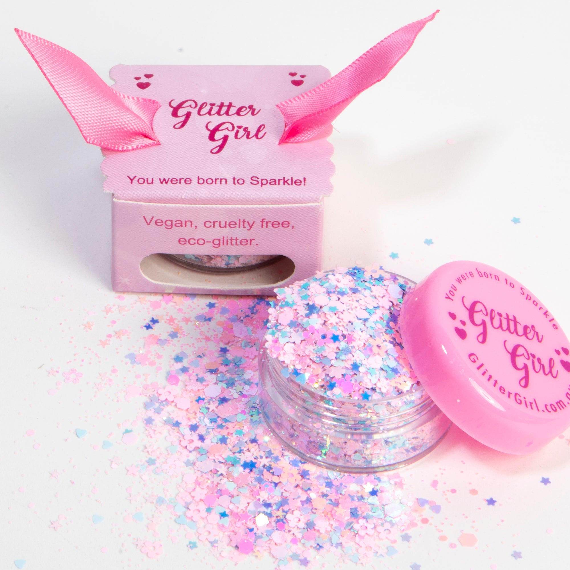Get ready to shine with Glitter Girl's Loose Glitter in "Fairy Floss," a dazzling cosmetic eco glitter mix featuring soft pastel pink and baby blue hearts, paired with delicate baby stars. This whimsical blend is perfect for creating dreamy, magical looks.