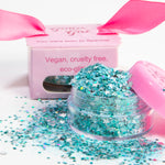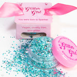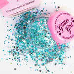 Get ready to shine with Glitter Girl's Loose Glitter in "Dazzle Delight," a dazzling cosmetic eco glitter featuring glistening blues, aqua dots, and shimmering silver stars. This captivating mix is perfect for creating bold and magical looks.