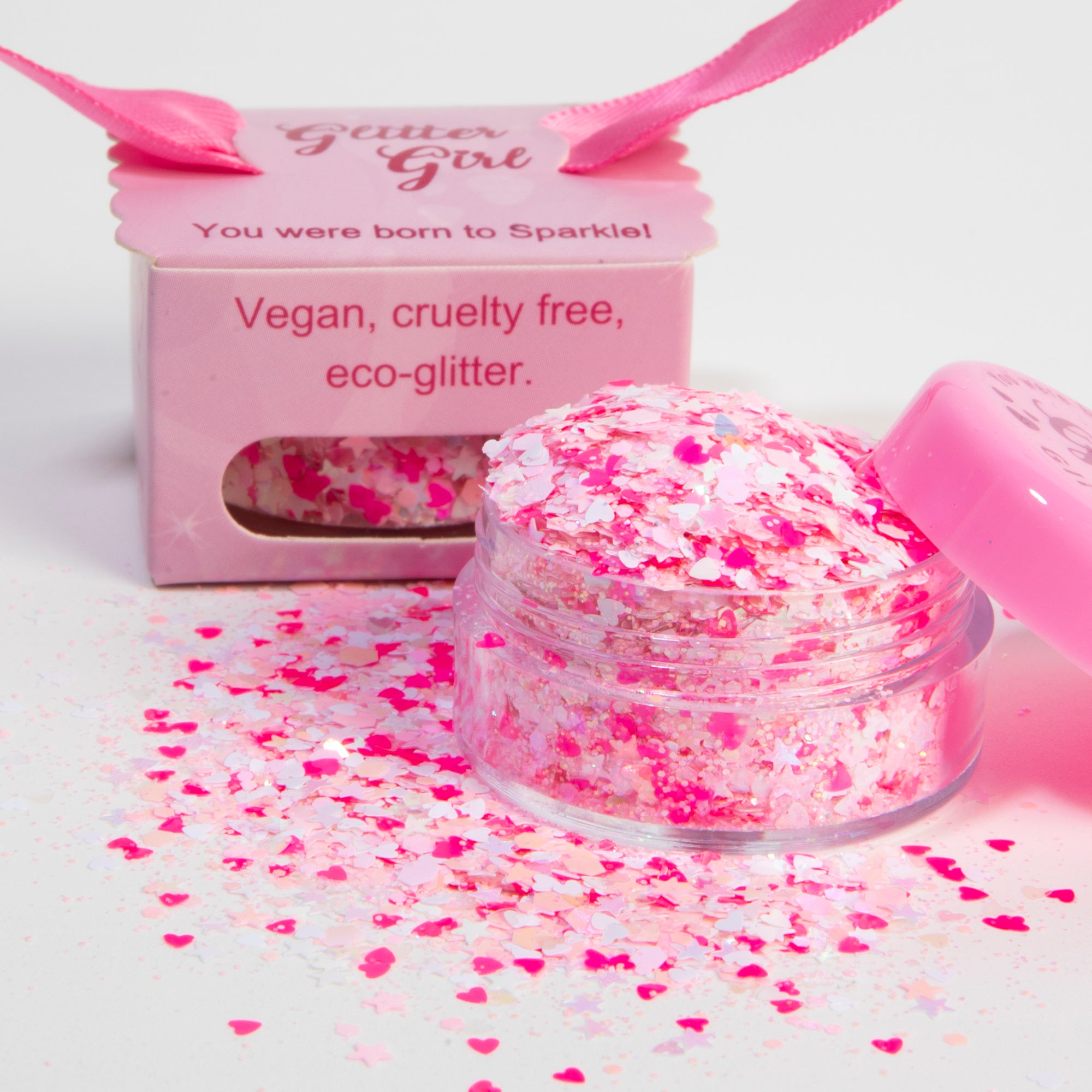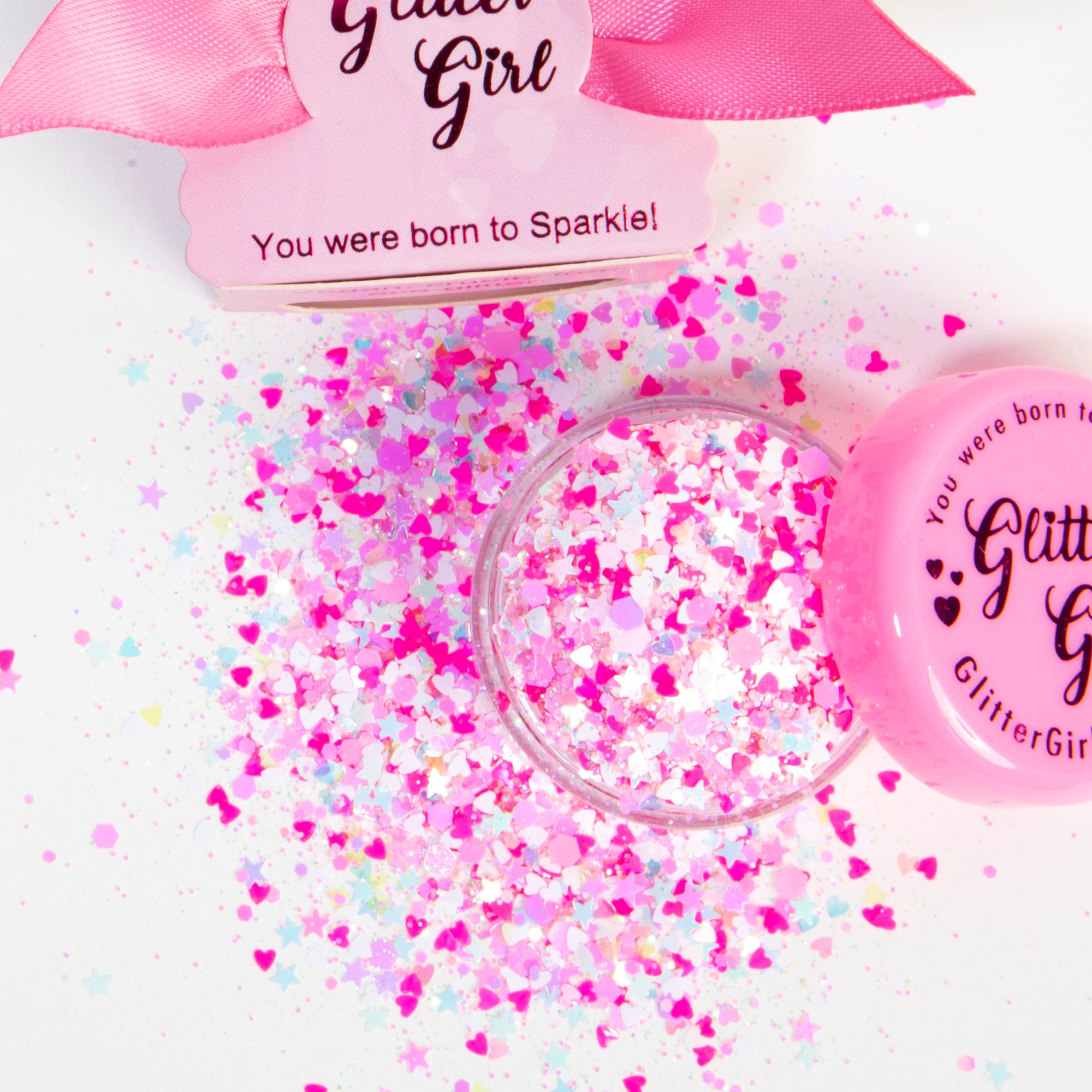Get ready to shine with Glitter Girl's Loose Glitter in "Lollipop Lane," a dazzling cosmetic eco glitter mix featuring soft pastel pink and white hearts, complemented by delicate baby stars. This sweet and whimsical blend is perfect for creating playful, magical looks.